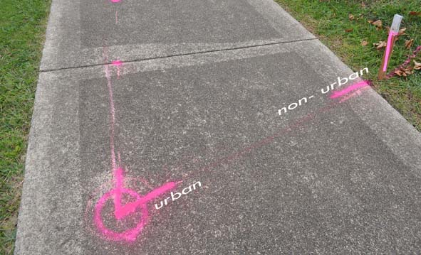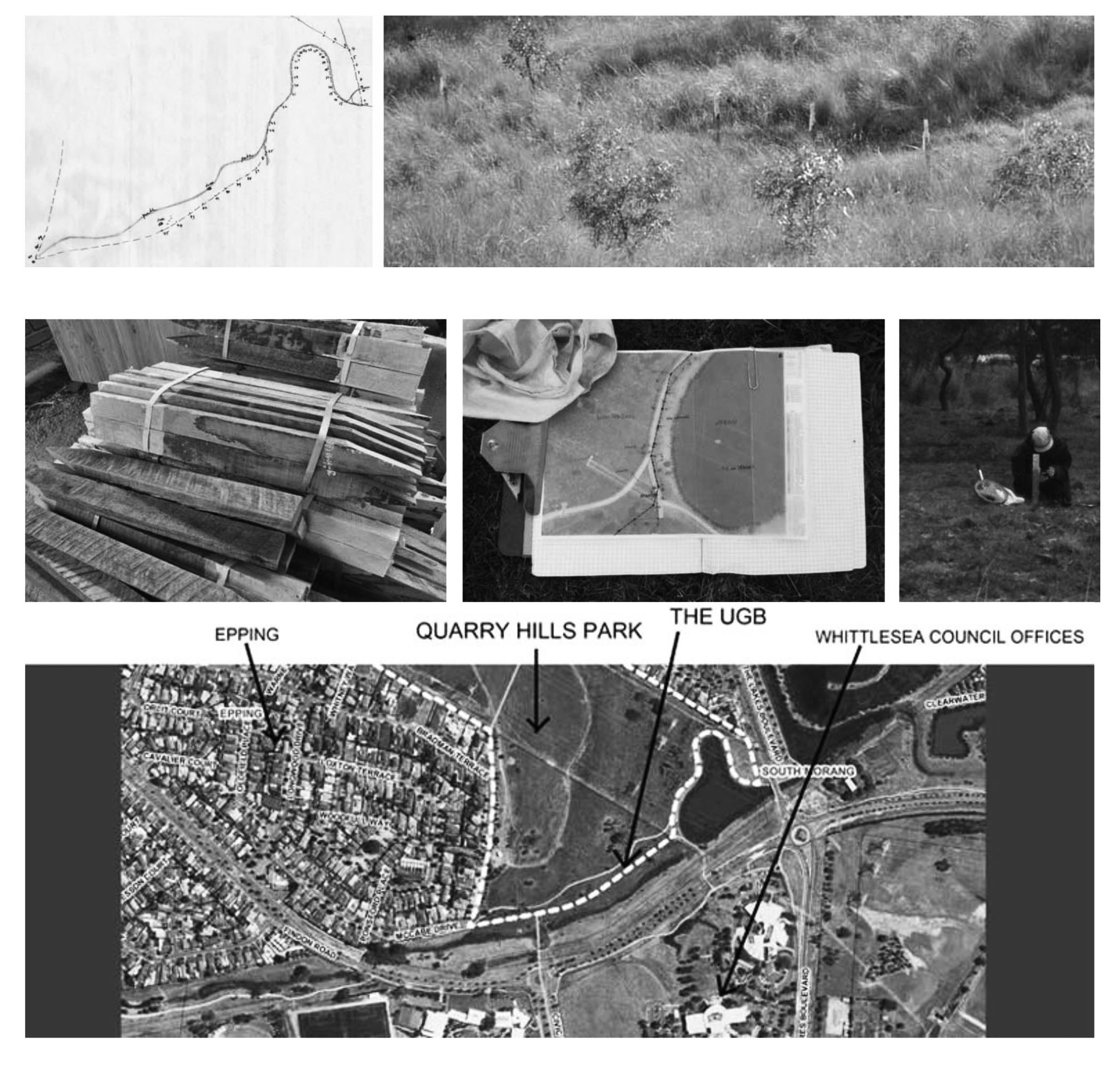 Staked Out simply marked a length of the Urban Growth Boundary, as shown on the planning schemes maps, across a section of a public park using land surveying timer stakes and pink spray paint. The UGB was rendered visible revealing the division of urban from non-urban land across the parkland.The location of the UGB seemed often illogical and contradictory pointing to bureaucratic handling at the scale of a region rather than place. Presenting the UGB against the detail and beauty of a specific site, Staked Out aimed to prompt reflections on how and where we, as a city, are prepared to set our urban limit.