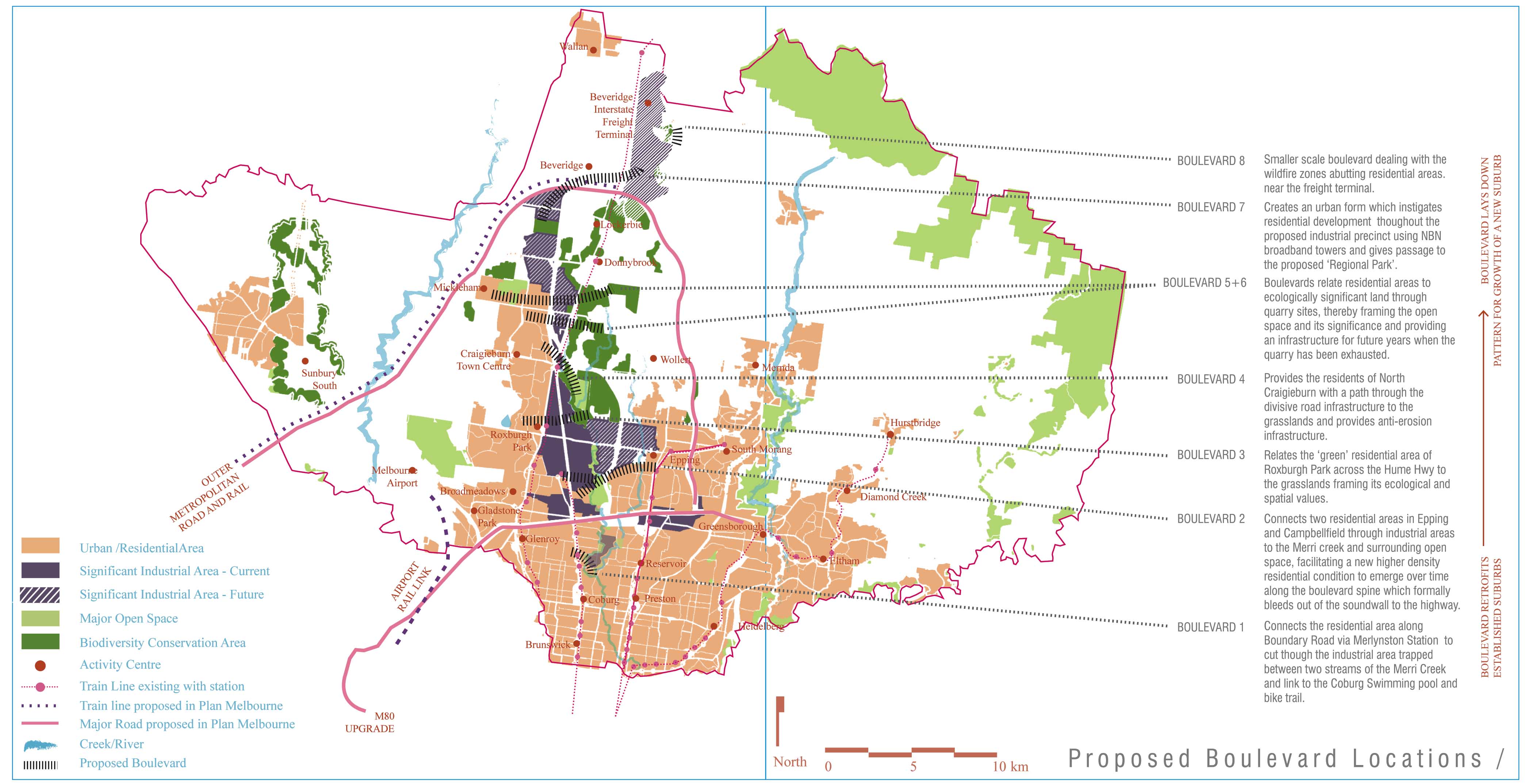 The planned urban growth of Melbourne seeks to create increasingly ‘liveable’ suburbs and a ’20 minute city’. Students were asked to examine specific areas of the outer-urban landscape and develop interventions and strategies that could guide the consolidation and enhancement of existing urban areas, accommodating increasing populations, as well as shape alternative ways of imagining new greenfield suburban areas.